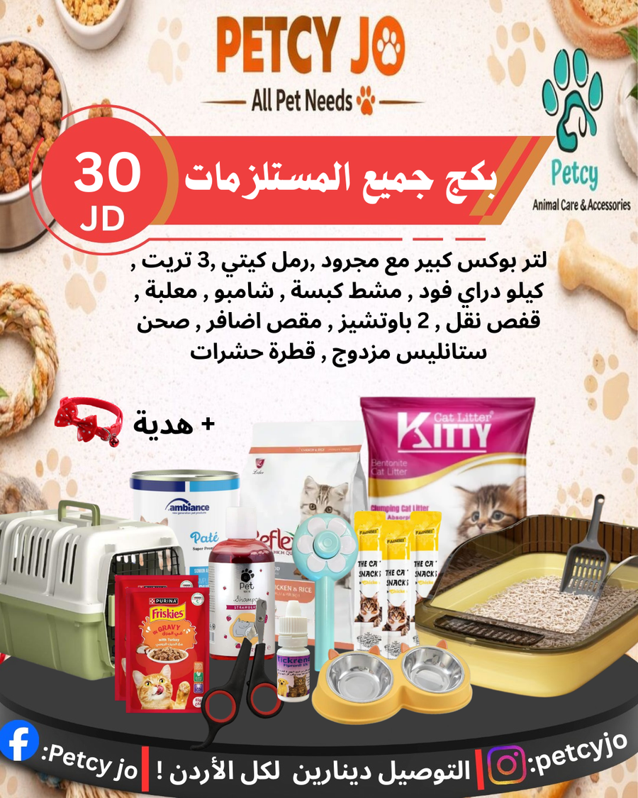 لتر بوكس مفتوح كبير - رمل كيتي - كيل ودراي فود - مشط بخار - شامبو تركي - اثنين باوتشيز - معلبة - مقص
